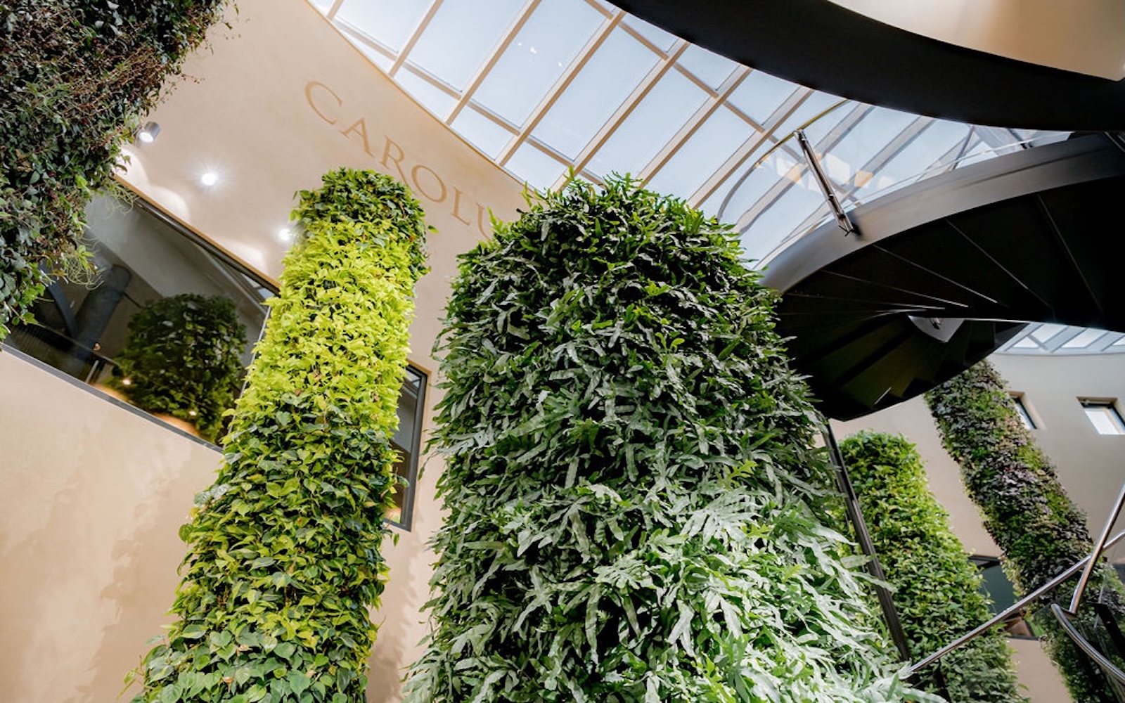 Mit der Gestaltung der Pflanzensäulen in der Carolus Therme wurde eine architektonische Lösung entwickelt, die Natur, Form und Raum auf eindrucksvolle Weise verbindet. Die vertikale Struktur der begrünten Elemente betont nicht nur die Höhe des Raumvolumens, sondern schafft zugleich eine optische Verbindung zwischen den Geschossen.