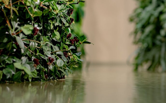 Besonderes gestalterisches Merkmal ist das skulpturale Spiel mit Richtungen: Die Säulen wachsen als Stalagmiten aus dem Boden und spiegeln sich im Wasser. Diese dynamische Anordnung erzeugt eine verspielte Stimmung im Raum und verwandelt die Begrünung in ein raumbildendes Kunstwerk.