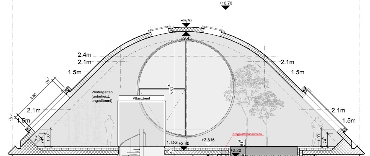 Der doppelgeschossige Wintergarten entlang der Westfassade ist rund 67 m² groß und als üppiger «Garten im Haus» konzipiert. Bäume, Büsche und Stauden schaffen einen lebendigen, grünen Rückzugsort im Innern.
