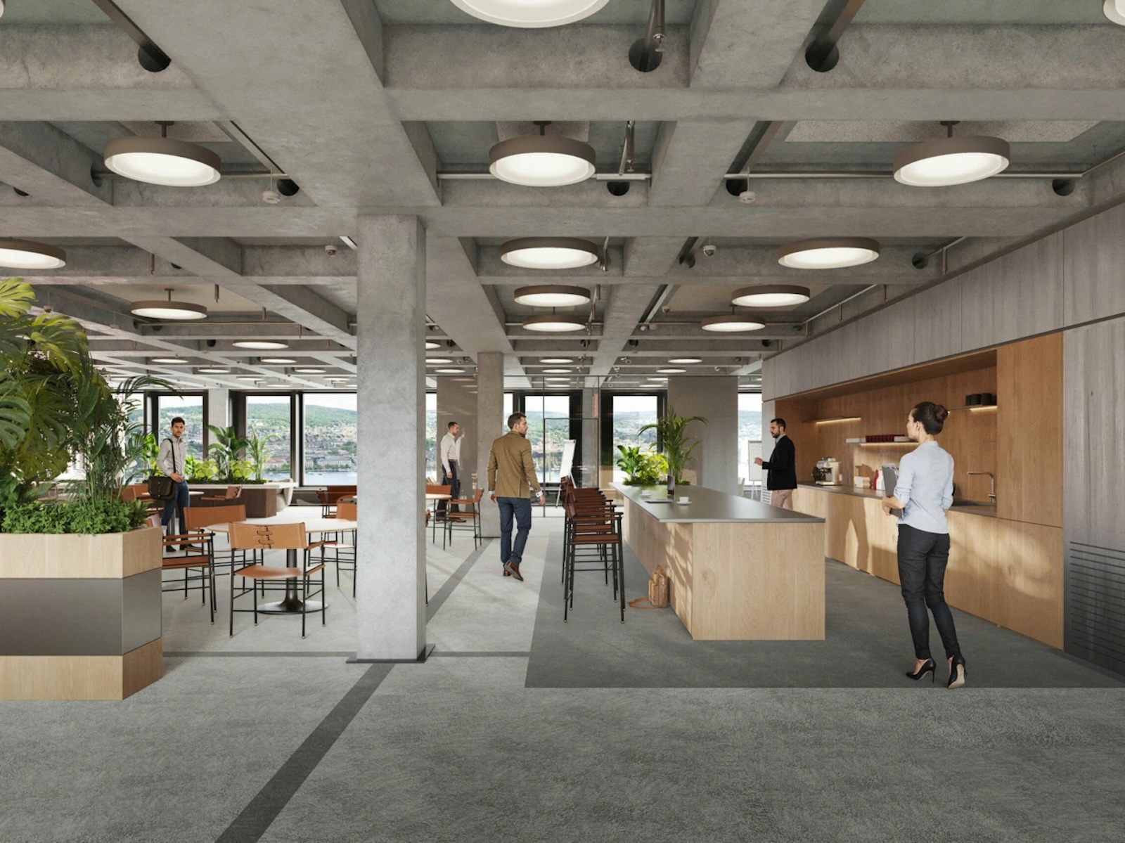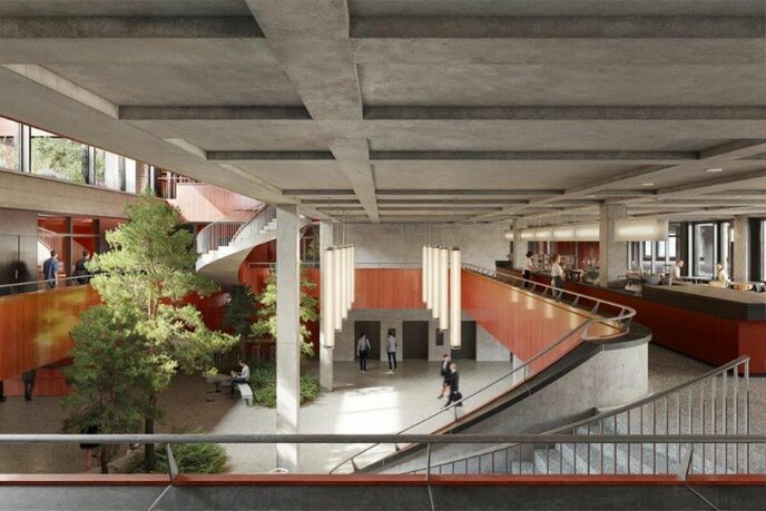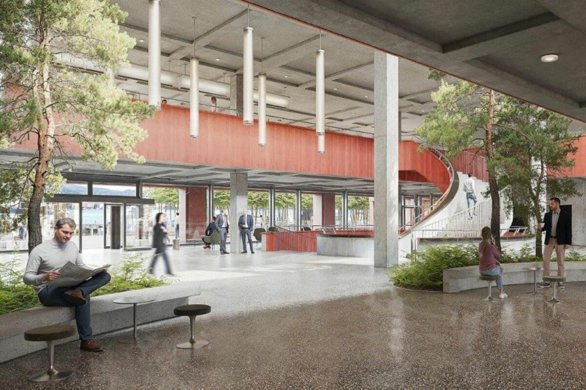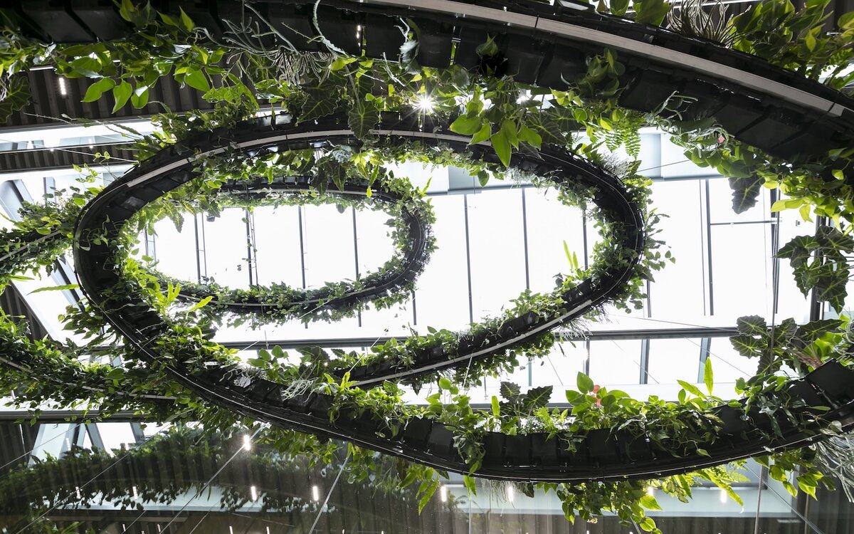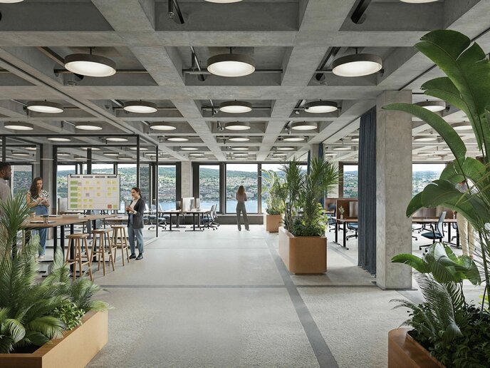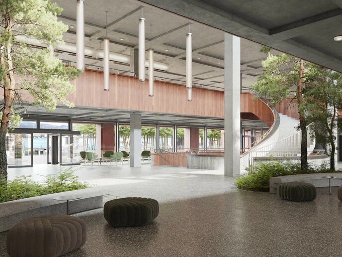 Die markante Gebäudefigur fügt sich in die Seefront ein und bietet Potenzial für hochwertige Begrünungslösungen an Innenraum und Dachflächen. Begrünte Elemente unterstützen die Nachhaltigkeitsziele des Campus, fördern das Mikroklima und steigern die Aufenthaltsqualität.