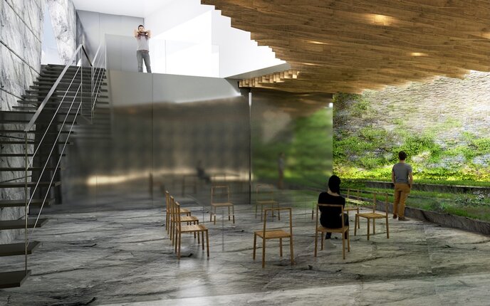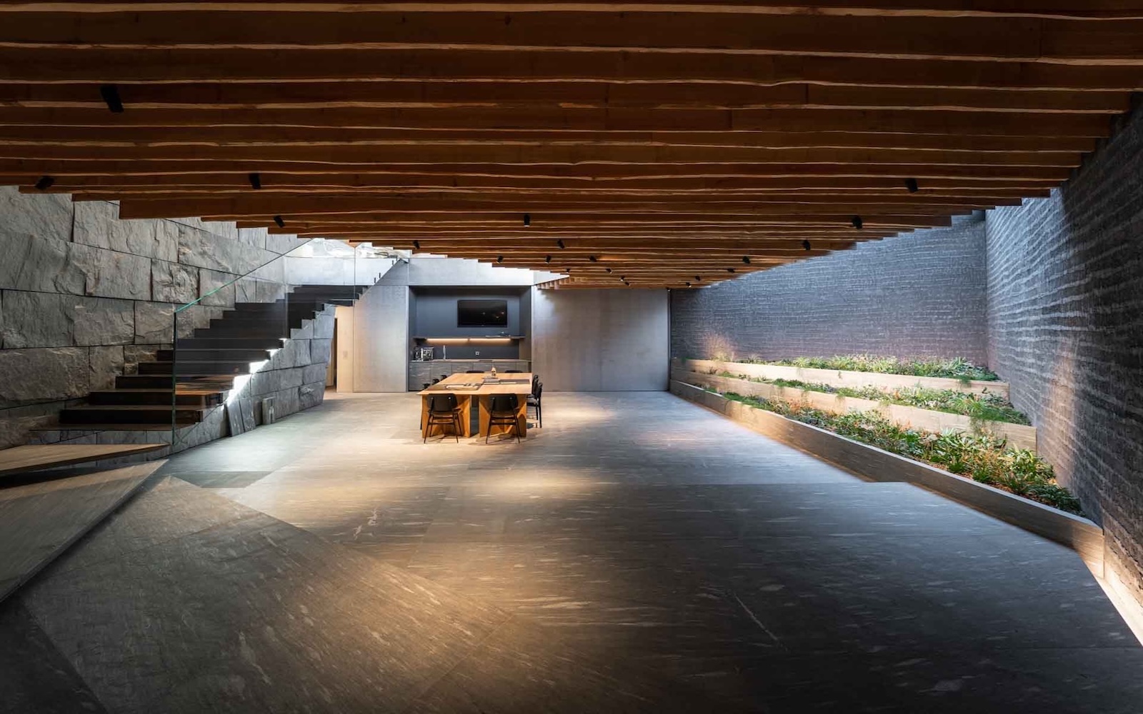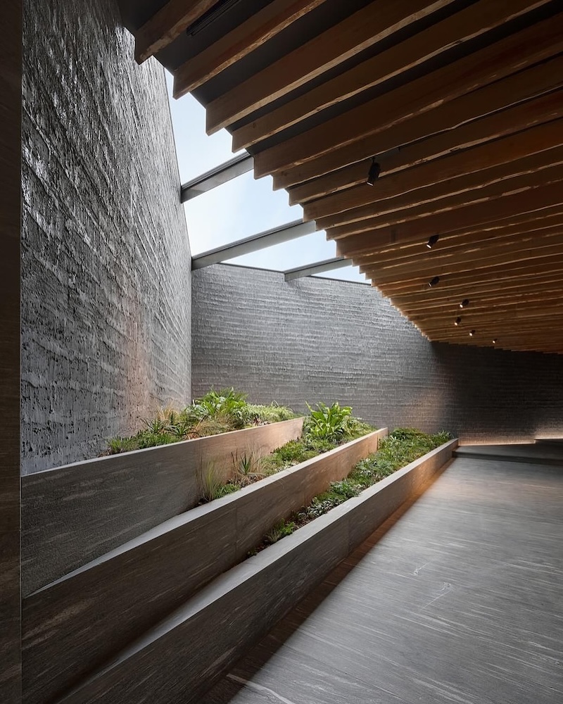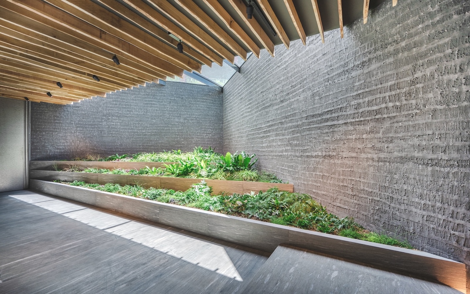 Die abwechslungsreichen Vegetationsmuster der alpinen Region von Vals, die sich in kurzen Abständen verändern, wurden bewusst in die Gestaltung integriert und als zentrales Element der Rauminszenierung interpretiert. Trocken-felsige Strukturen an den Wänden stehen im Gegensatz zu saftigen Wiesenbereichen auf horizontalen Beeten, Treppenstufen und Pflanzenwänden. So entsteht nicht nur ein Spiel aus vertikaler und horizontaler Natur, sondern auch ein lebendiger Raum mit angenehmer Atmosphäre.