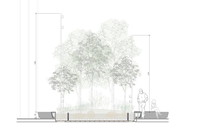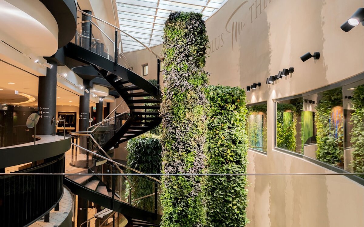 Das Atrium bildet das grüne Herzstück des Gebäudes: Ebenen übergreifende Grossbäume verbinden die Stockwerke und schaffen einen fliessenden Übergang zwischen Innen- und Aussenbereichen. Die Pflanzeninseln schaffen lebendige, inspirierende Räume für über 2.000 Mitarbeitende.